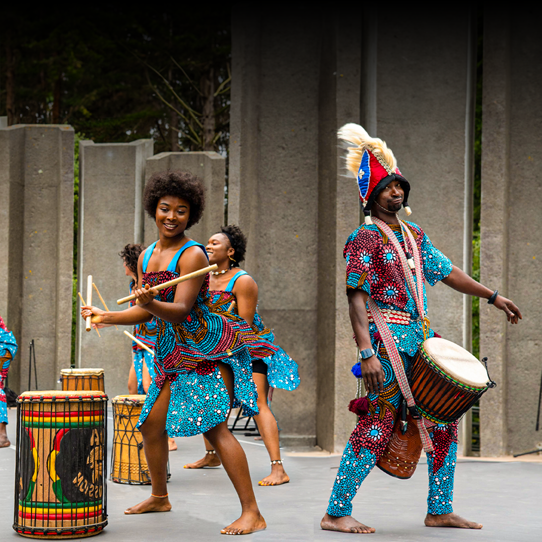 Duniya Dance and Drum's offerings include: assemblies, live performances, heritage month performances, in-person and virtual dance movement workshops, traditional drumming lessons, and cultural arts programming in the Bay Area.